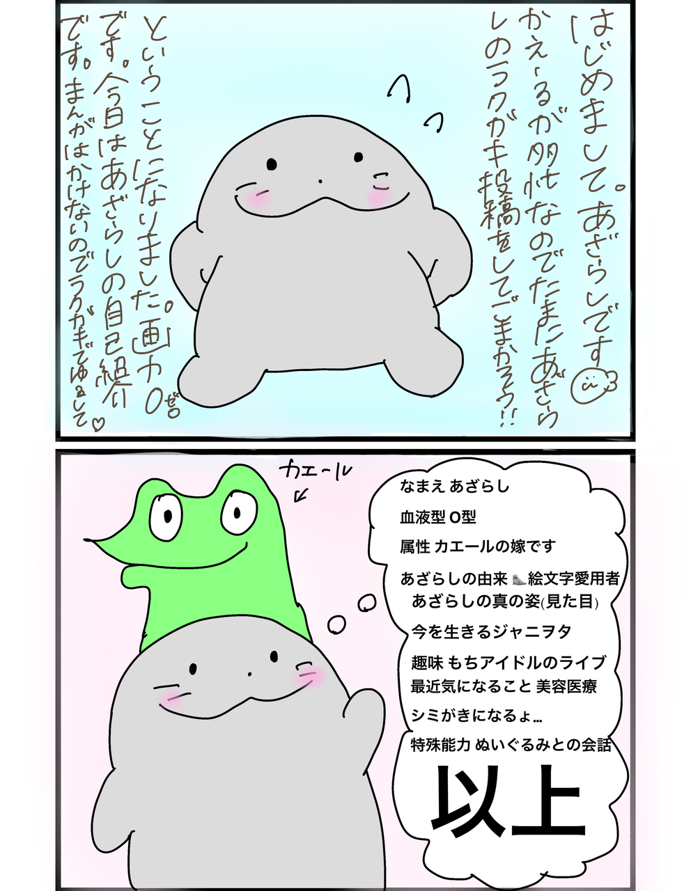 あざらし当番①「初めまして、あざらしです」 こんにちは!毎週日曜日はあざらしのラクガキコーナーになりました!カエールが過労で倒れたらこまるので、、、ユルシテクレ ... こんにちは!毎週日曜日はあざらしのラクガキコーナーになりました!カエールが過労で倒れたらこまるので、、、ユルシテクレ 続きを読む 続きを読む